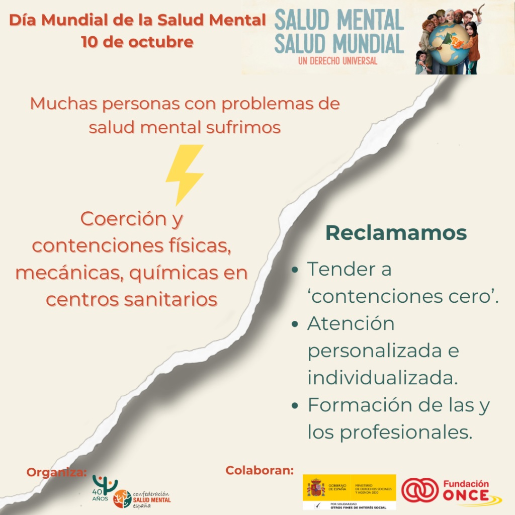 Con motivo del Día Mundial de la Salud Mental, la Confederación ha lanzado en redes sociales la campaña #SaludMentalDerechoUniversal, a través de la elaboración de una serie de infografías en las que se explica la situación actual de coerción y tratos inhumanos que sufren las personas con problemas de salud mental, y se contraponen a las posibles alternativas que propone el movimiento asociativo: